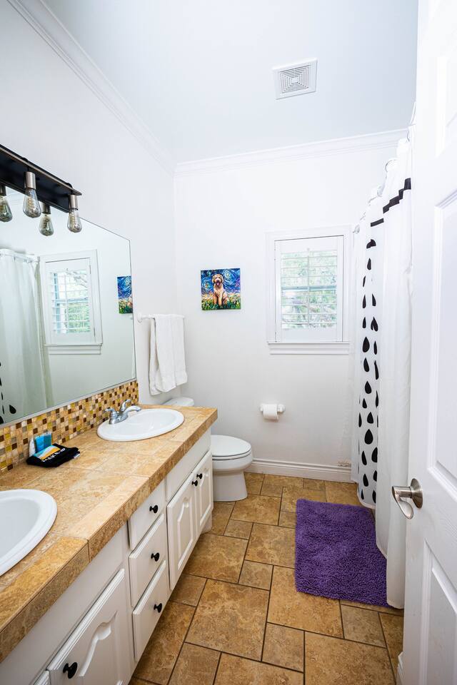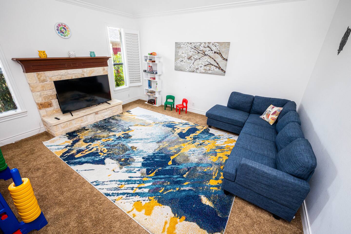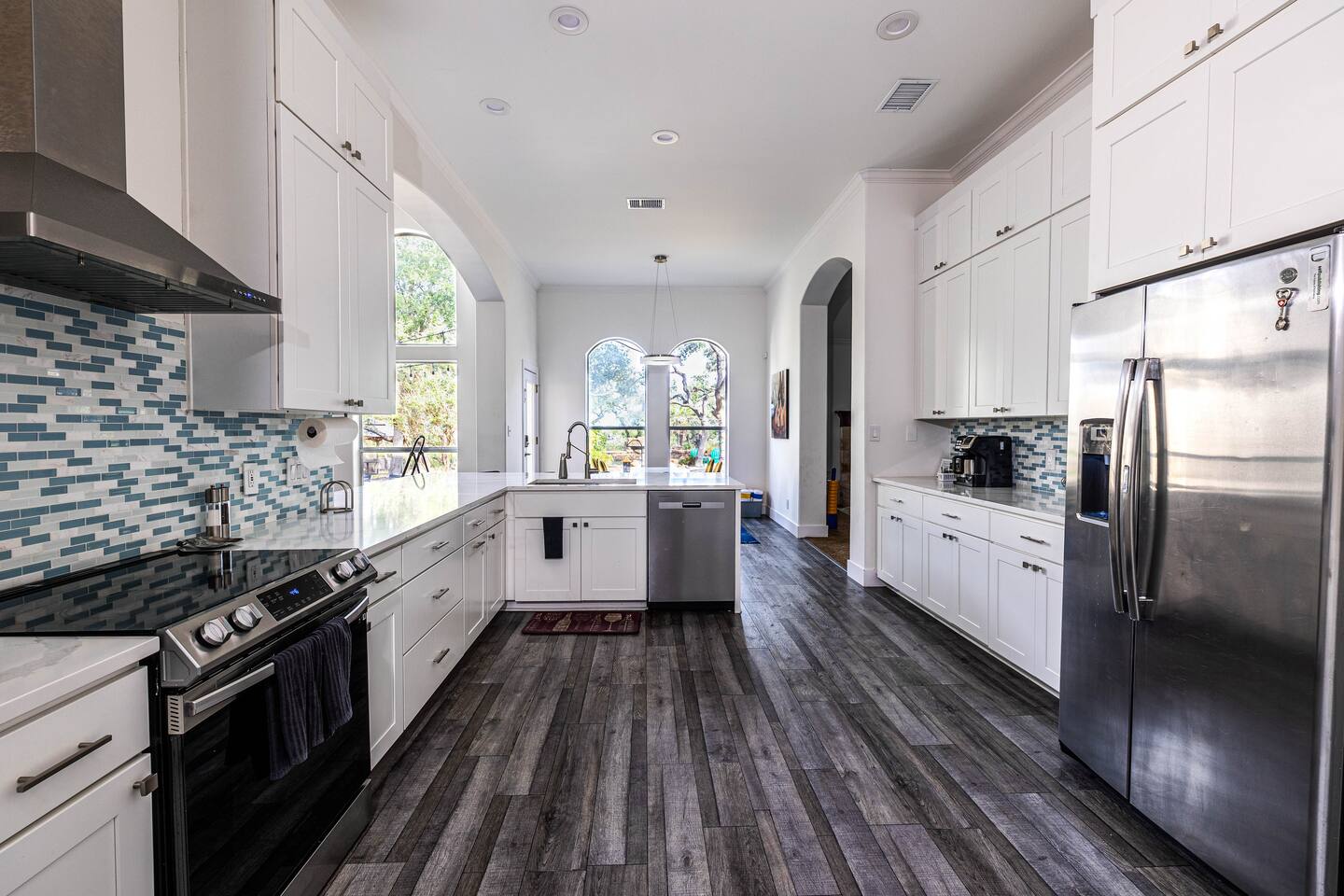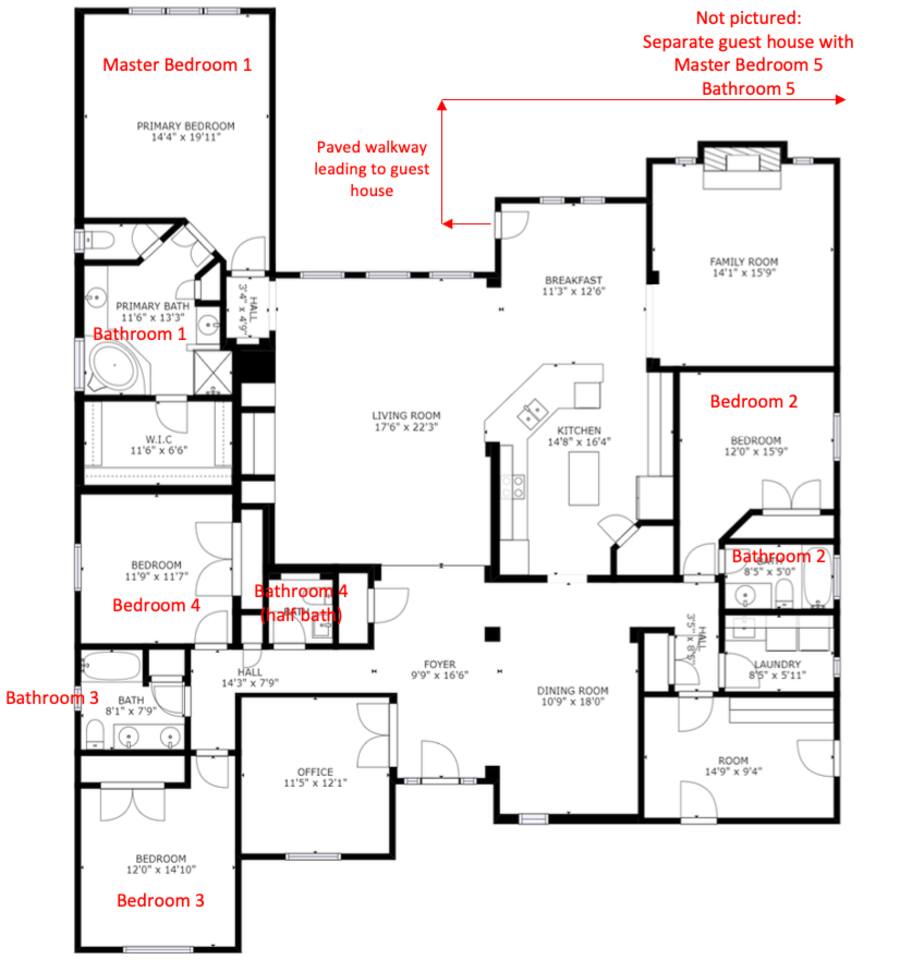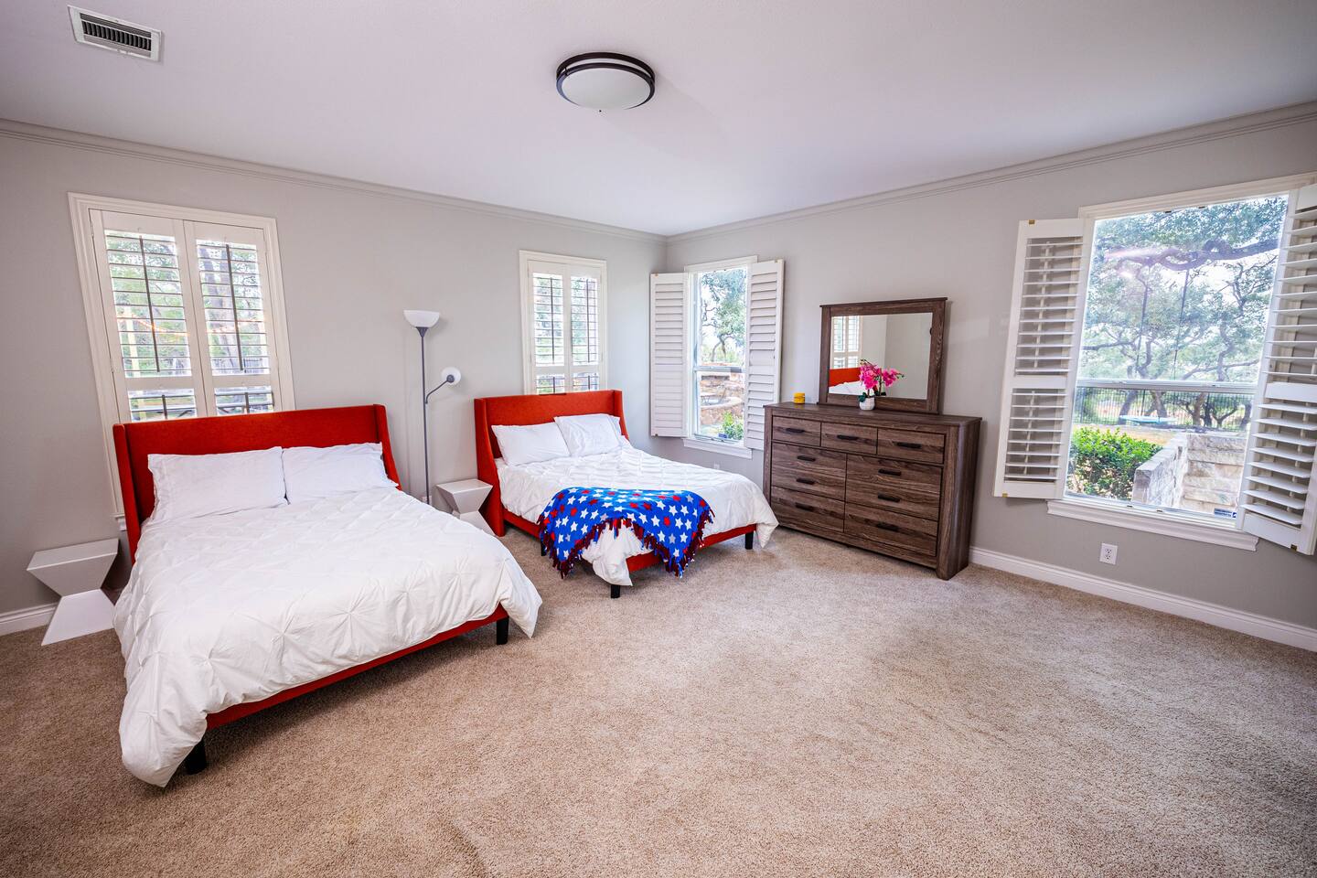 NO GUEST SERVICE FEE ~ we are covering our guest service fees for new bookings!! This beautiful 2-acre property is located in a safe & convenient area of South West Austin (Oak Hill / Circle C area). It's perfect for a large group seeking relaxation, space, outdoor fun, a gorgeous resort-style pool with waterfall features and 2 separated full homes just steps away from each other! 20 pool towels included for your group’s use. MAIN HOUSE… Bedroom 1 - Master Bedroom - King Bed, sleeps 2 Bedroom 2 - Queen bed, sleeps 2 Bedroom 3 - Full over Full bunk bed, sleeps 4 Bedroom 4 - Queen bed, sleeps 2 Bedroom 6 - Queen bed, sleeps 2, desk Dedicated Work Space / Mud Room - Futon, sleeps 1 ~~ Bathroom 1 - attached to master bedroom, large jacuzzi tub, standing shower Bathroom 2 - attached to bedroom 2, shower-tub Bathroom 3 - unattached to any rooms, dual sinks, shower-tub Bathroom 4 - unattached to any rooms, powder room with no shower CASITA / GUEST HOUSE…only steps away from the Main House and 100% ADA accessible with wide doors, no steps, double entry and fully flat home Bedroom 5 - in Casita, 2 Full beds, sleeps 4, desk Bathroom 5 - attached to bedroom 5 in Casita, shower-tub, separate stacked washer and dryer -----> Comfortable sleeping for up to 17 people Plenty of space to spread out with 2 full kitchens, 2 living rooms, family room, formal dining room and private office. 4388 sqft Main house is 3200sqft Casita (Guest House) is 1188sqft