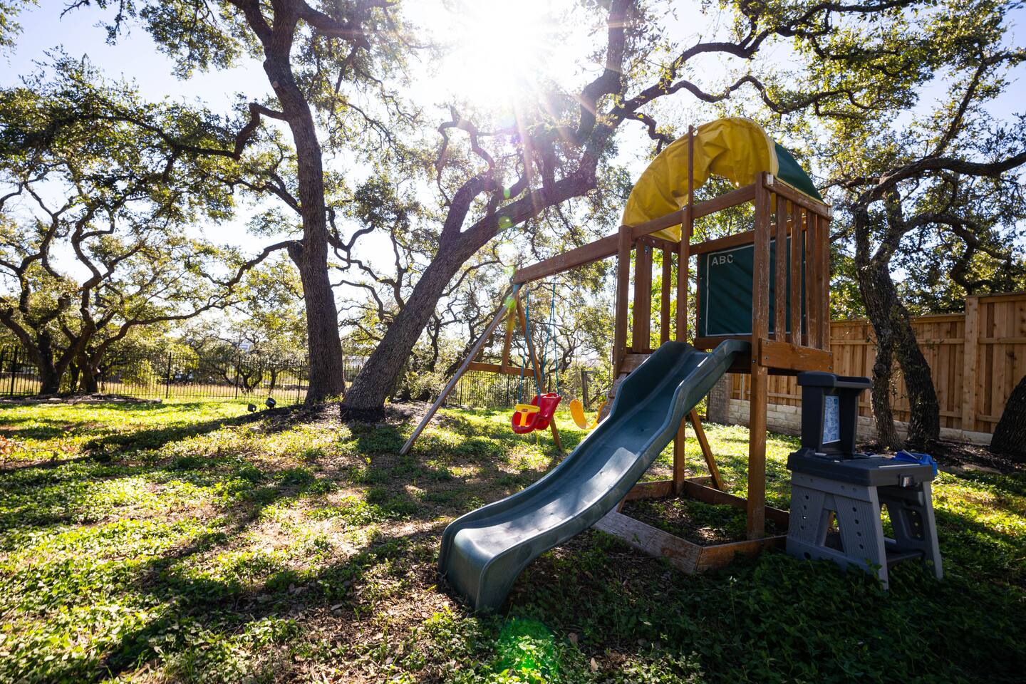 The pool is uncovered with no fence, please use at your own risk. There is a playscape that is NOT secured to the ground, please play at your own risk.